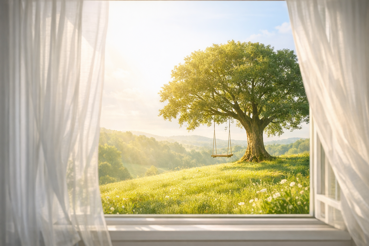 - 朝、カーテン越しの光が入る部屋